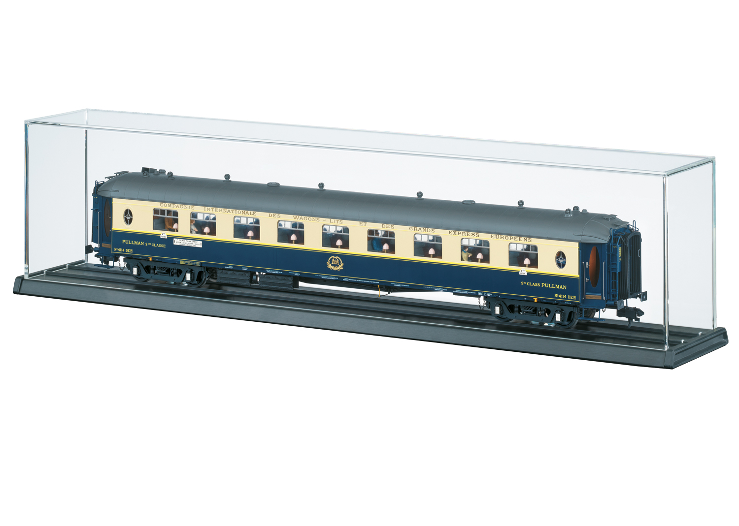 Modell: CIWL-Salonwagen ohne Küche. Präsentations-Handarbeitsmodell mit Plexiglas-Schutzhaube/Aluminium Präsentationssockel und eingebauten Metall-Figuren. Der Wagen kann zur Präsentation als auch im Fahrbetrieb verwendet werden. Fahrzeug weitestgehend in Metall umgesetzt. Wagenaufbau und Dach aus Messingblech mit angesetzten Messing-Schleudergussteilen und nur wenigen Teilen aus Kunststoff. Wagenboden aus Aluminium. Metallfiguren in neuer Farbgestaltung ab Werk eingebaut. Angesetzte erhabene CIWL-Logos aus Metall. Vorbildgerechte Inneneinrichtung. Hochdetaillierter Wagenboden und Drehgestelle. Klappbare Übergangsbleche. Türen zum Öffnen. Kurzkupplungskulisse für Klauenkupplungen. Serienmäßig eingebautem Digital-Decoder für Beleuchtung der Einstiegsbereiche, Deckenbeleuchtung 2. Klasse, Vorraum links und rechts digital schaltbar, ebenso wie Tischlampen. Eingebauter Strompuffer. Hochfeine vorbildgerechte Inneneinrichtung. Schraubenkupplungen ab Werk montiert. Befahrbarer Mindestradius 1.020 mm (mit Klauenkupplungen). Länge über Puffer ca. 73,3 cm. (2 Klauenkupplungen im Lieferumfang enthalten)